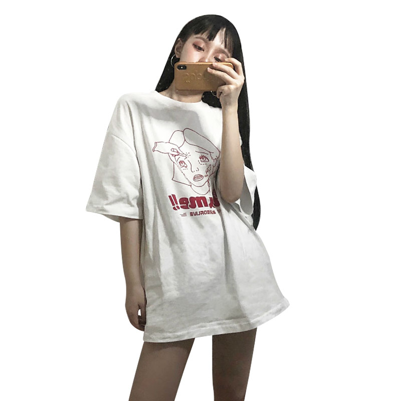韓版中長款寬松卡通女孩怪味少女短袖T恤夏季學生上衣女裝bf風潮