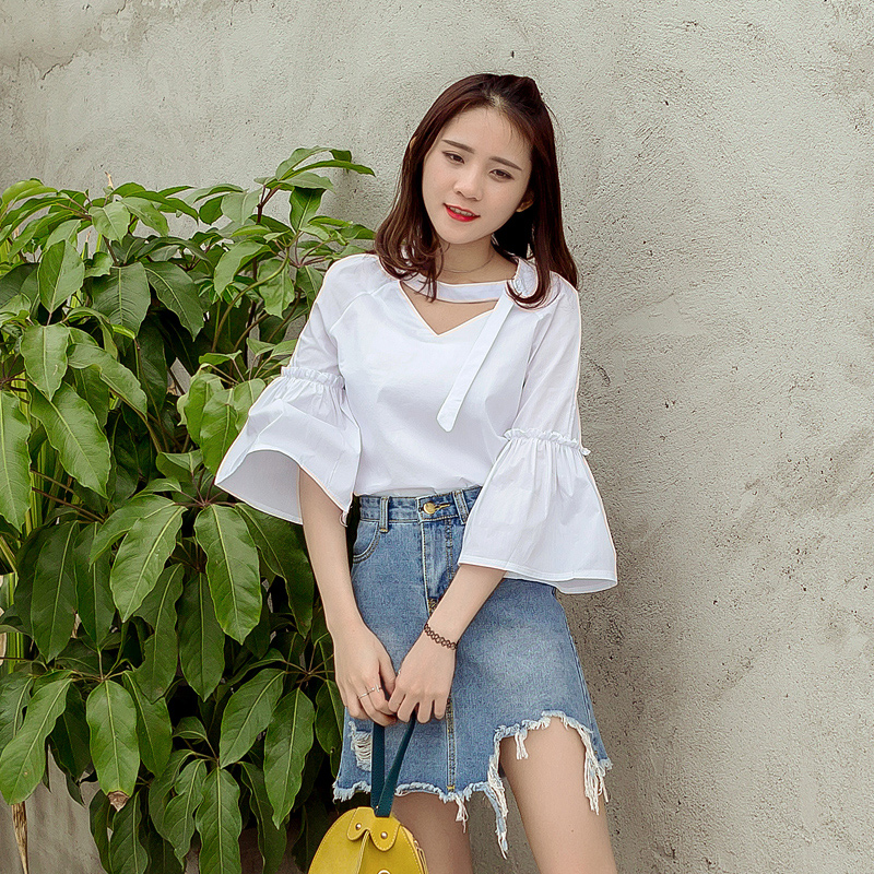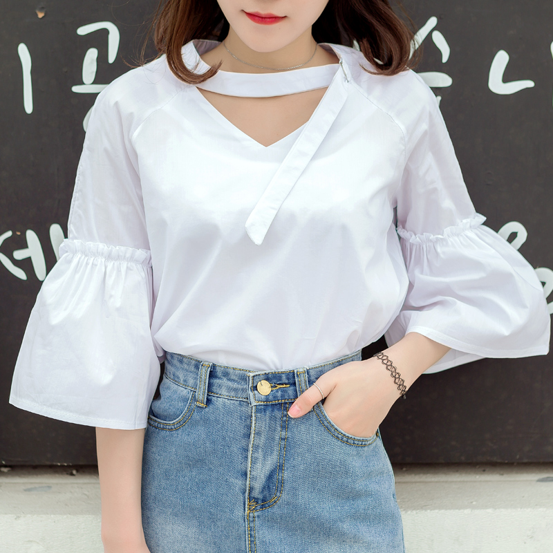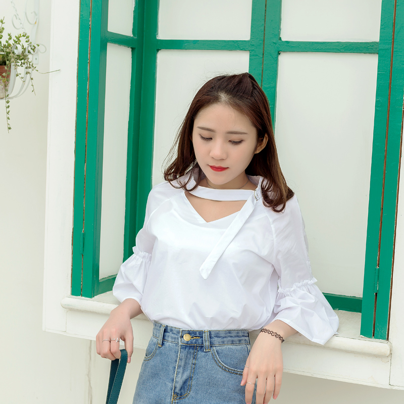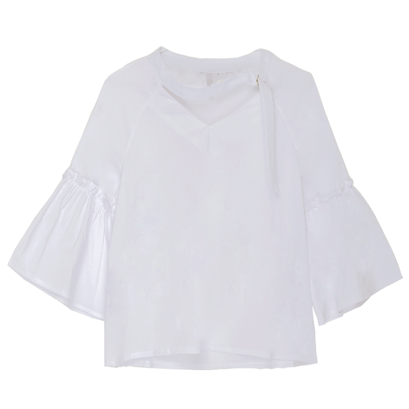 / 夏新款韓范簡約寬松V領休閑百搭打底喇叭袖襯衫顯瘦潮