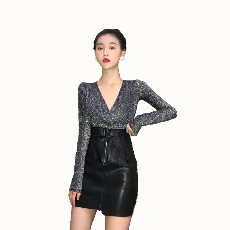 / 秋冬港味深V領褶皺收腰顯瘦百搭長袖T恤+復古高腰百搭半身皮裙潮