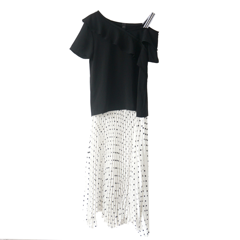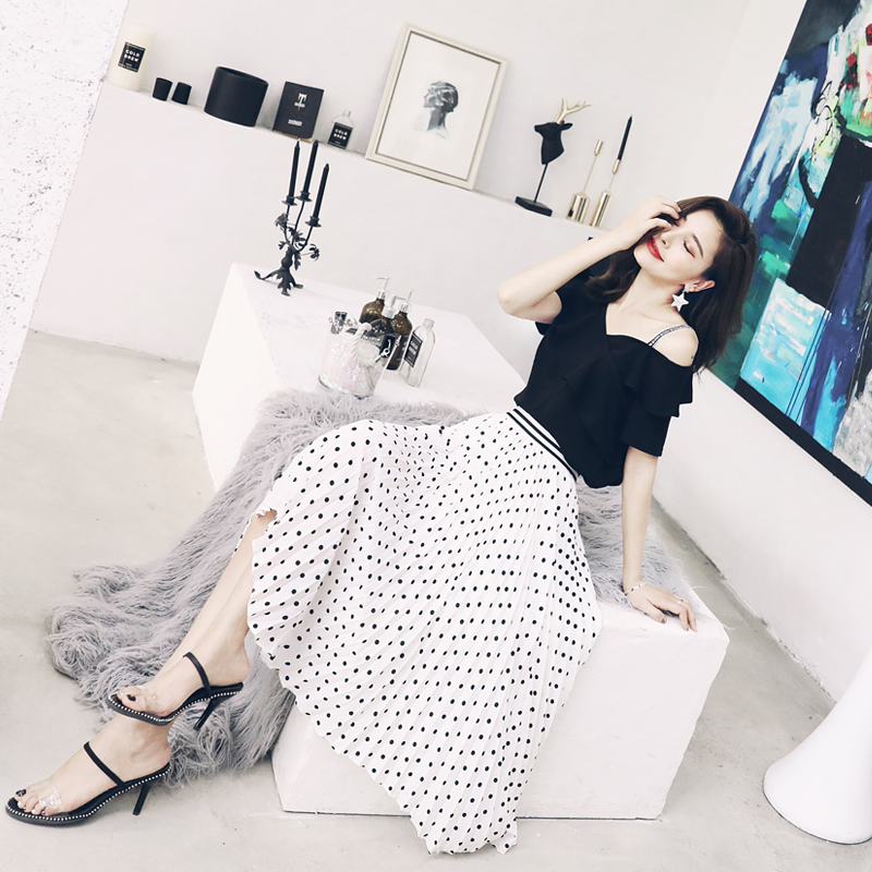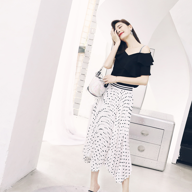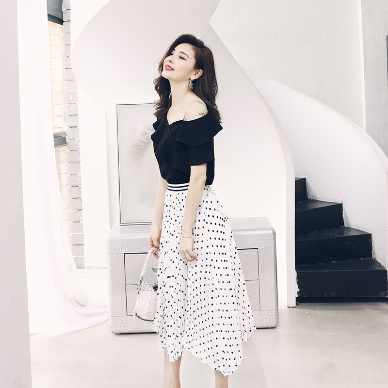 S秀淑女氣質2018夏季新款時尚露肩上衣半身圓點裙套裝兩件套潮