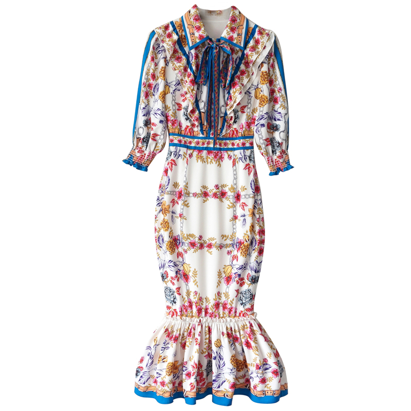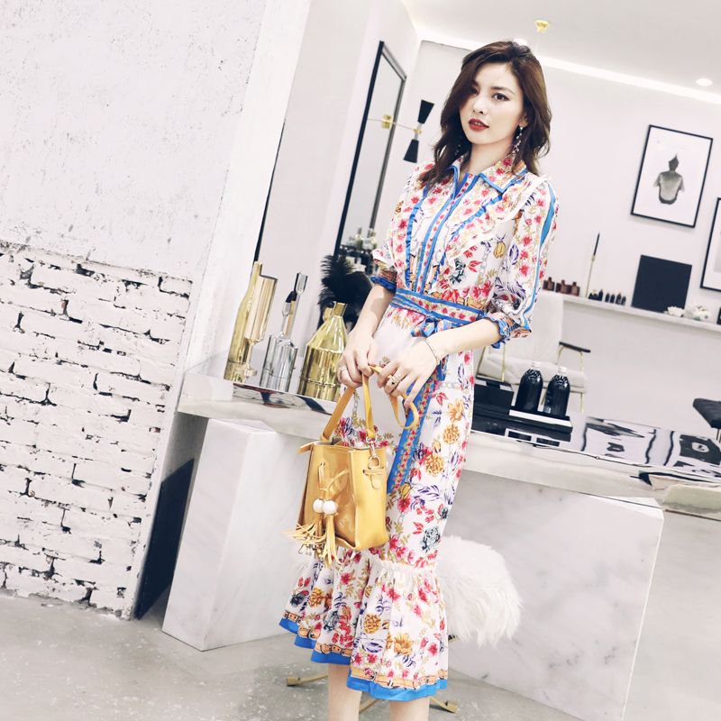 / S秀2018夏季新款印花拼接連衣裙復古修身氣質中長款一步裙花瓣袖
