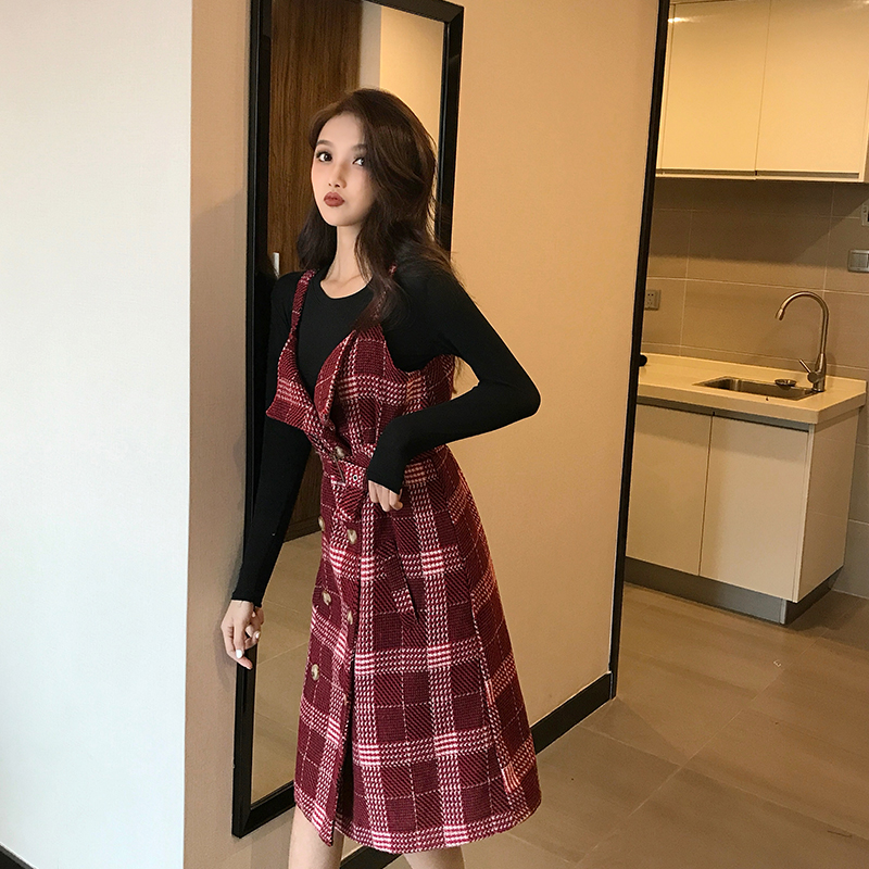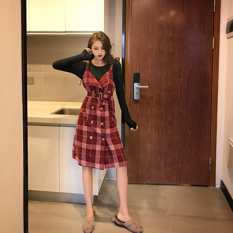 2018秋季新款韓版格子雙排扣吊帶裙設計感百搭女裝開衫外套連衣裙