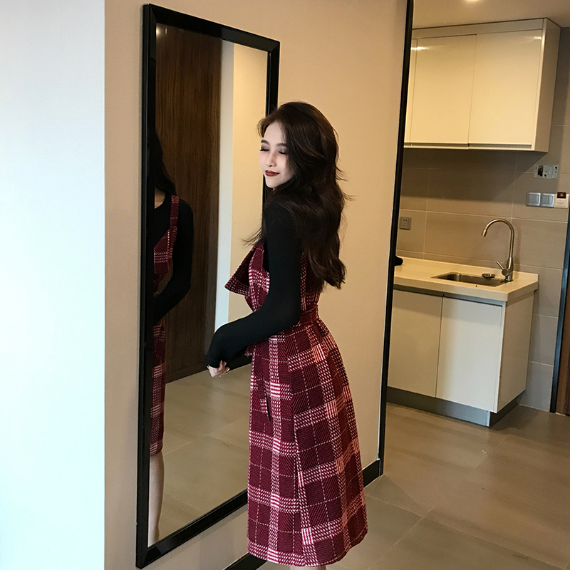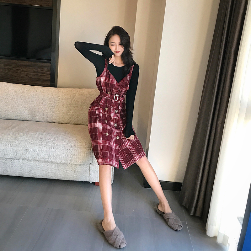 / 2018秋季新款韓版格子雙排扣吊帶裙設計感百搭女裝開衫外套連衣裙