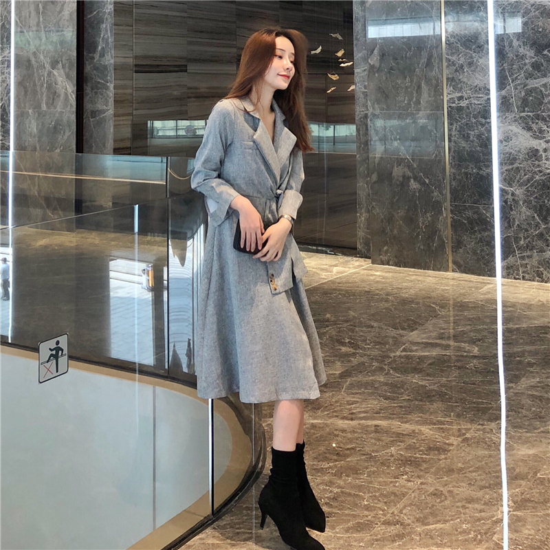 / 2018新款小香風設計感扭結系帶假袖子大翻領氣質大擺風衣裙外套潮