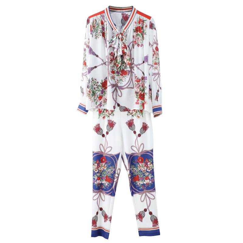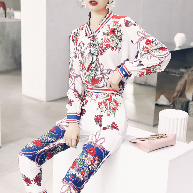 / 氣質兩件套2018秋季新款歐美女裝翻領長袖襯衫九分褲修身印花套裝