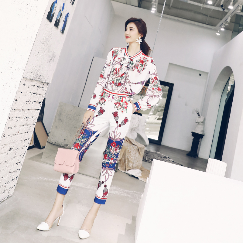 氣質兩件套2018秋季新款歐美女裝翻領長袖襯衫九分褲修身印花套裝