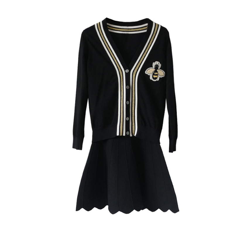 名媛2018春季新款學院風通勤針織兩件套長袖短裙修身套裝
