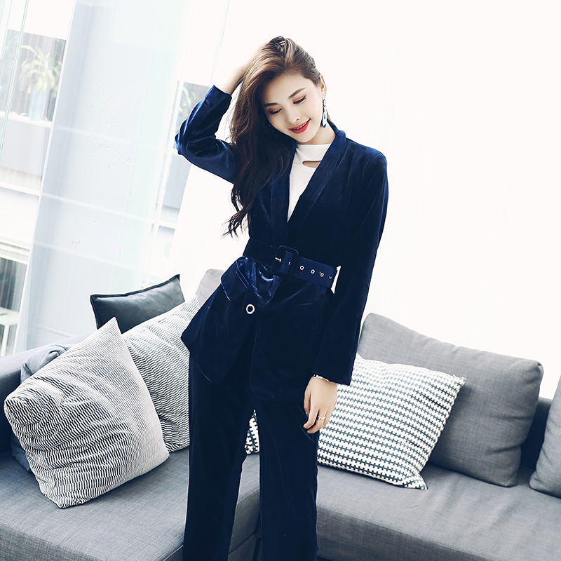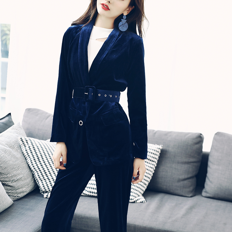 2018秋季新款韓版氣質名媛西裝套裝女時尚帥氣絲絨收腰顯瘦兩件套