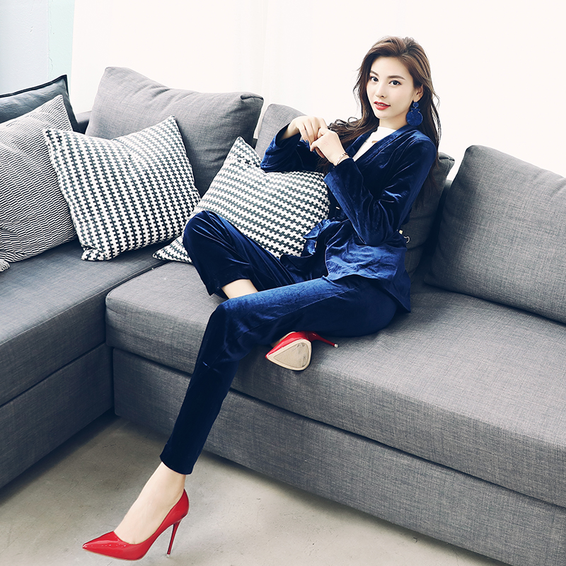 / 2018秋季新款韓版氣質名媛西裝套裝女時尚帥氣絲絨收腰顯瘦兩件套