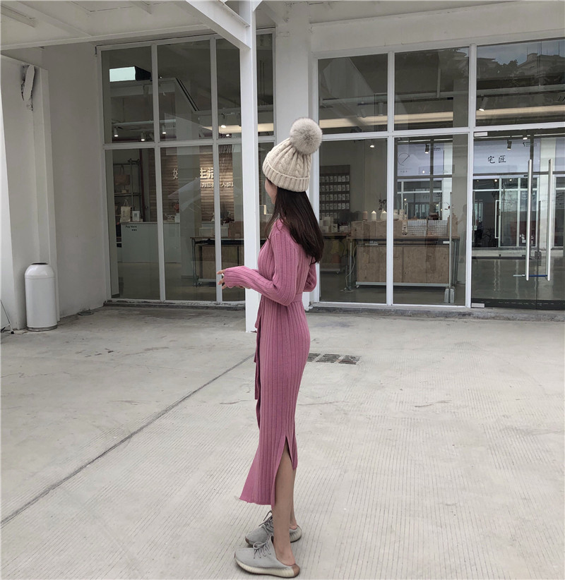 秋冬新款韓版時尚chic顯瘦長款開衫紐扣腰帶系帶V領開叉連衣裙女