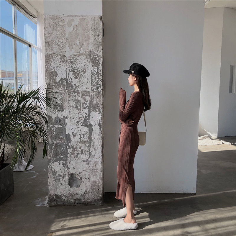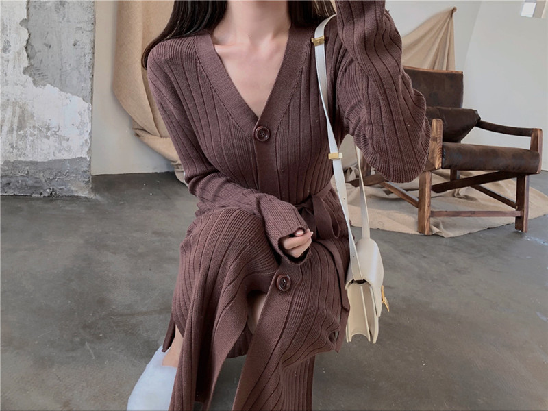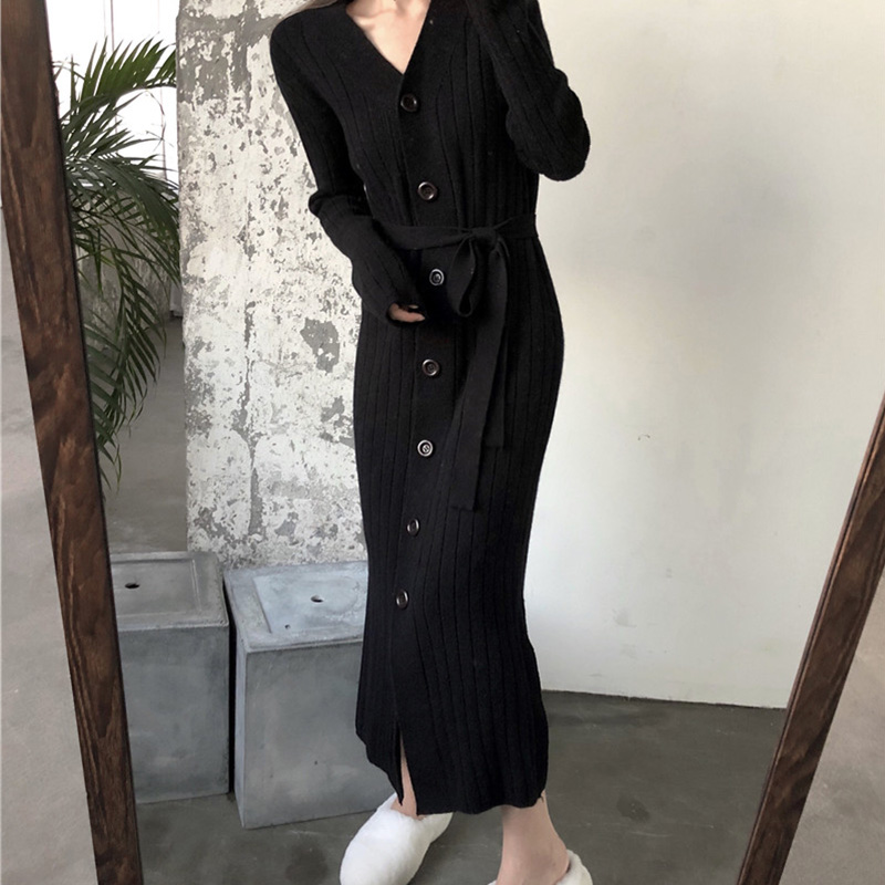 / 秋冬新款韓版時尚chic顯瘦長款開衫紐扣腰帶系帶V領開叉連衣裙女