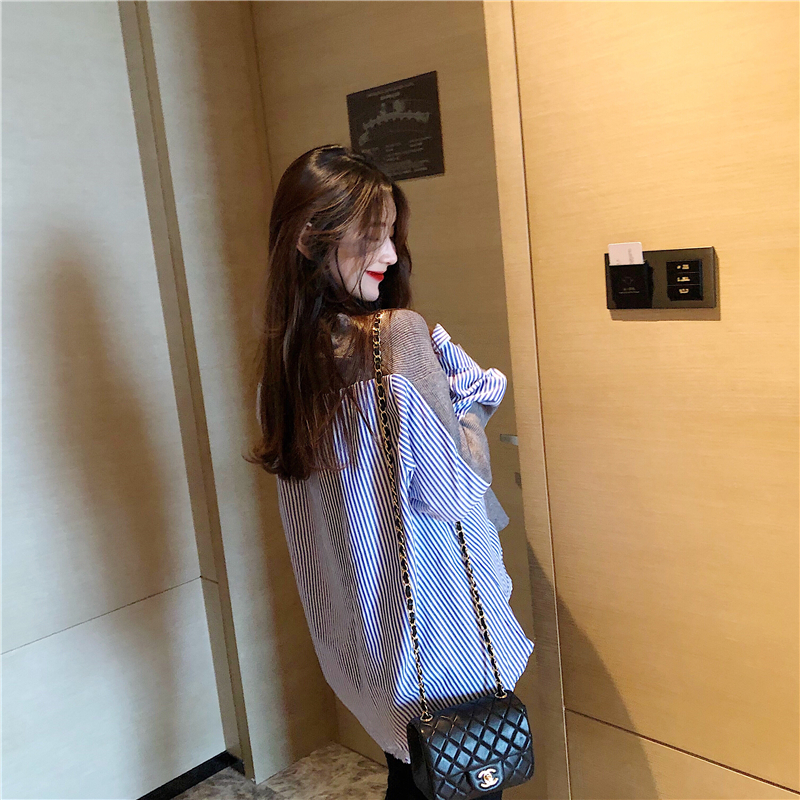 / 韓國慵懶風條紋拼接襯衣女2018新款秋冬針織開衫外套女假兩件上衣