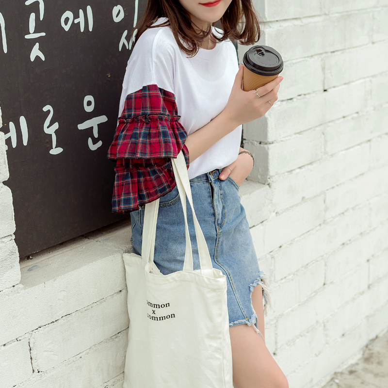 / 春夏裝韓版chic復古喇叭袖格子休閑拼接T恤衫寬松顯瘦上衣