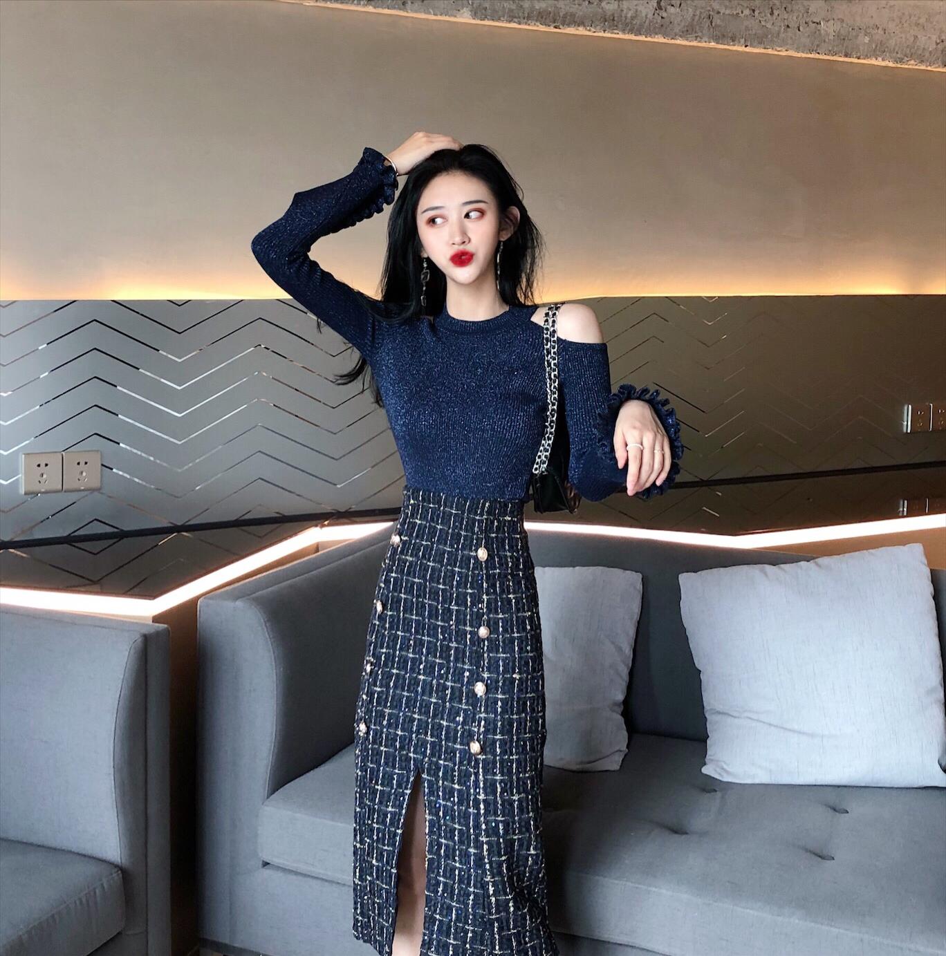 復古露肩心機喇叭袖小清新針織上衣+粗花呢子格子開叉排扣半身裙