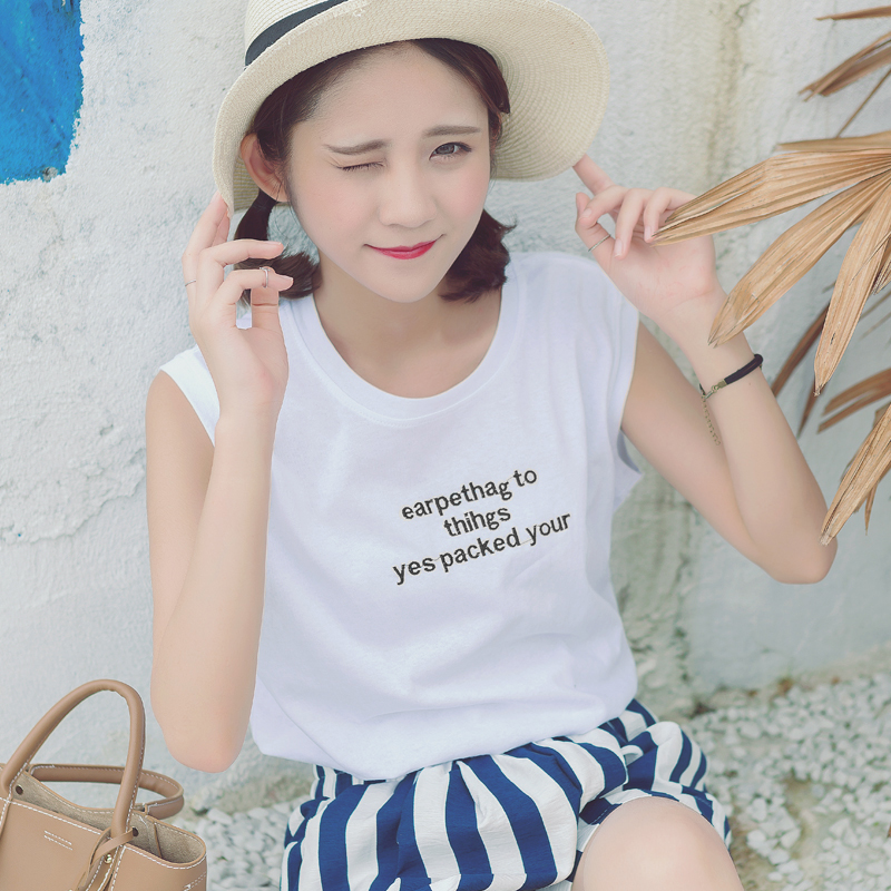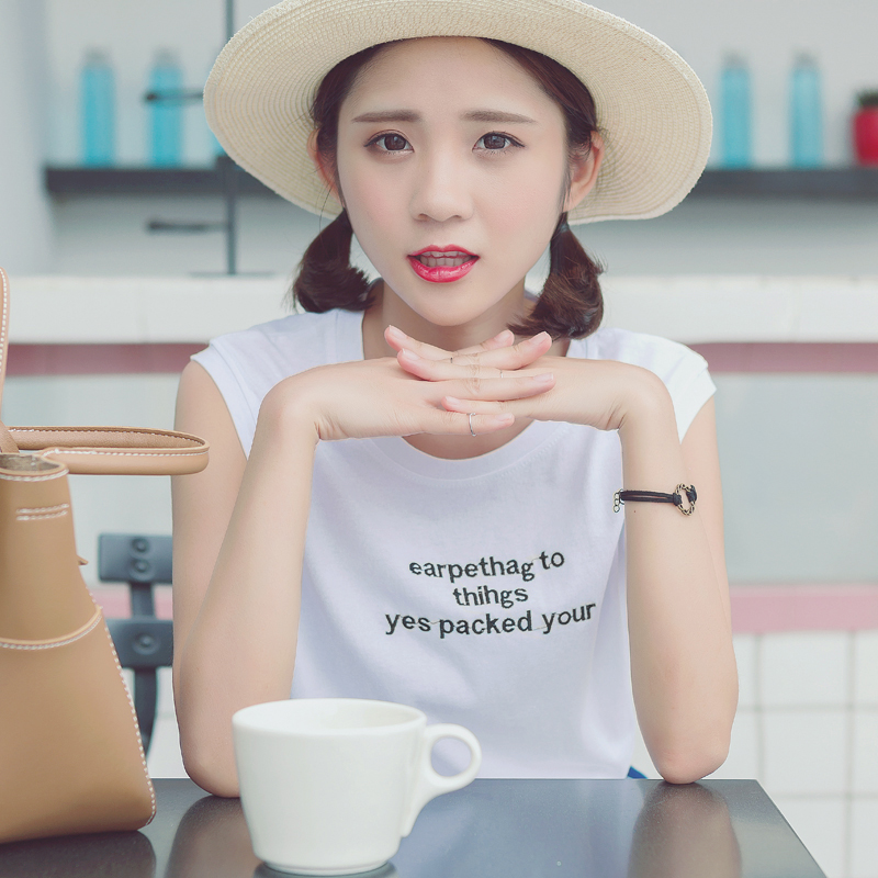 夏裝新款韓版女裝寬松無袖T恤女學生字母印花白色學生上衣潮